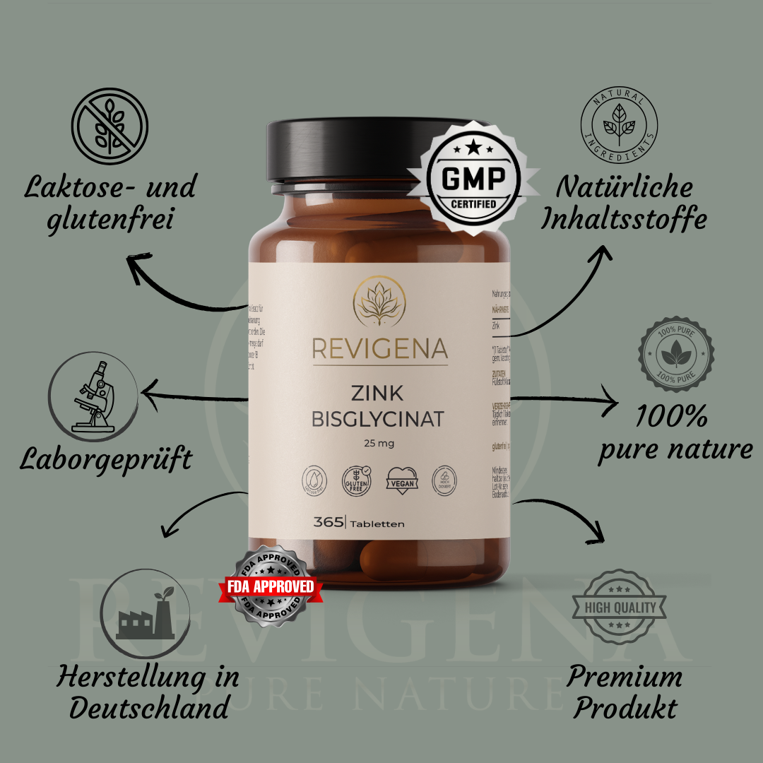 Unser Produkt enthält 25 mg elementares Zink in Form von Bisglycinat, einer organischen Verbindung, die vom Körper besonders gut aufgenommen und vertragen wird. Diese Chelatform ist magenfreundlich und für eine langfristige Einnahme geeignet.