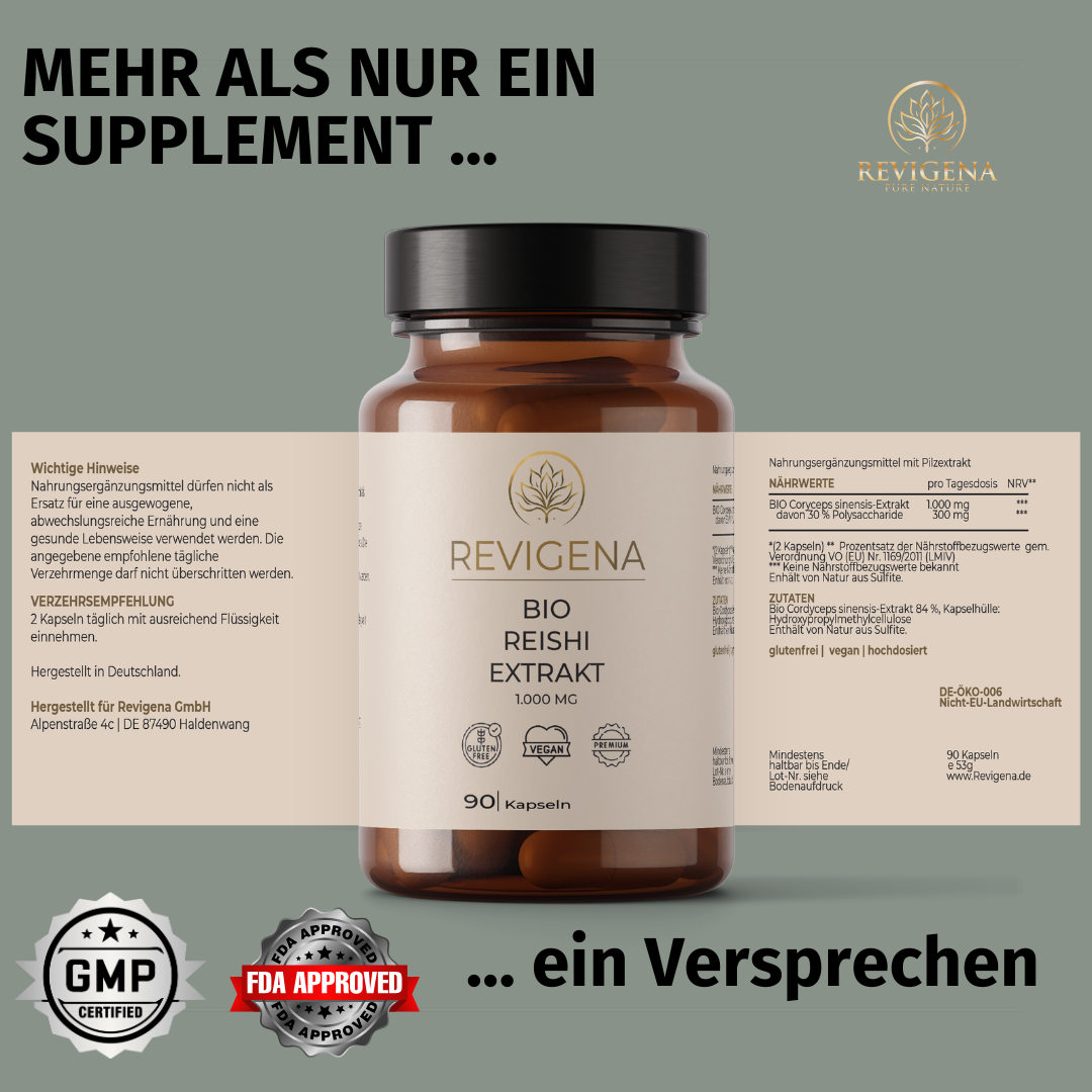 Der Reishi-Pilz ist seit über 2.000 Jahren fester Bestandteil der traditionellen chinesischen Medizin. Seine besondere Kombination aus Polysacchariden (v. a. Beta-Glucane), Triterpenen und Antioxidantien macht ihn zu einem vielseitigen Begleiter für Immunfunktion, mentale Belastbarkeit und Regeneration.