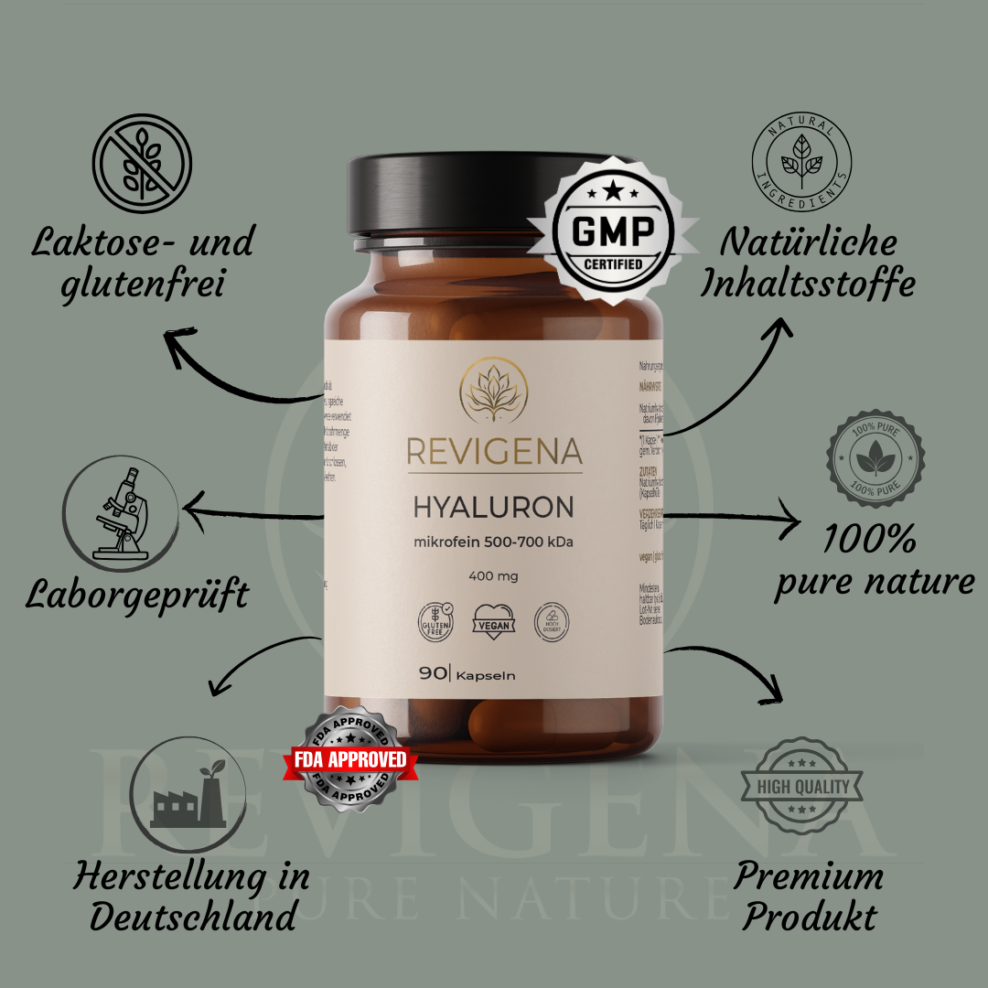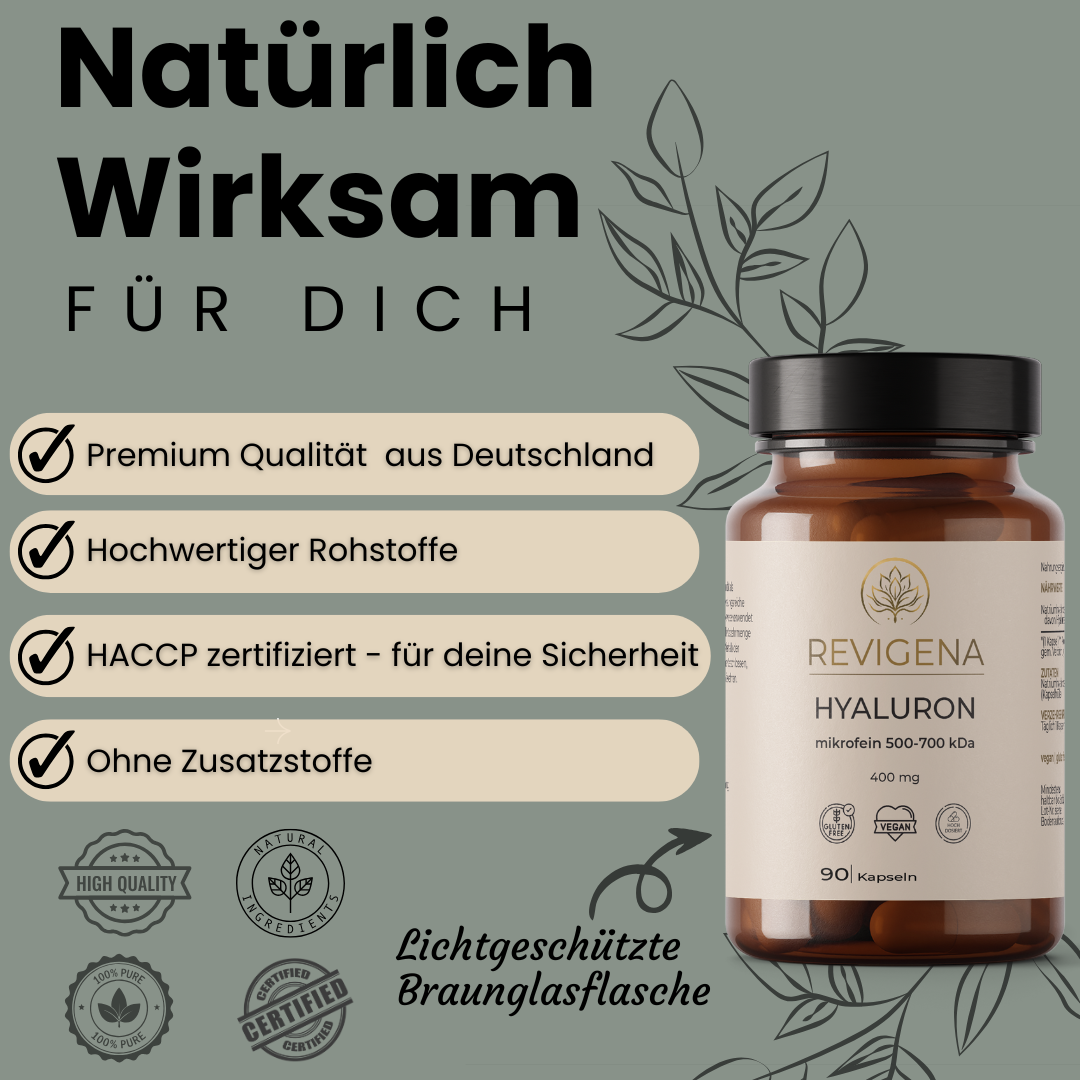 Unser Produkt liefert 400 mg hochmolekulare Hyaluronsäure pro Tagesdosis in besonders reiner Qualität – für eine spürbare Unterstützung der natürlichen Feuchtigkeitsbalance im Körper.