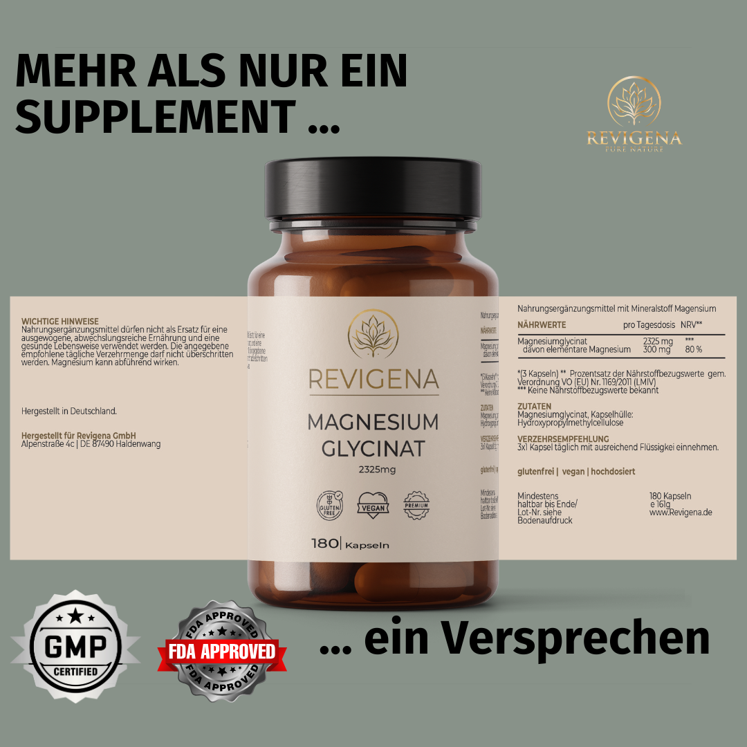 Magnesium ist an hunderten Prozessen im Körper beteiligt – von der Energiegewinnung bis zur Muskelfunktion. In der Form als Magnesium-Bisglycinat ist es organisch gebunden und besonders gut bioverfügbar. Die Kombination mit der Aminosäure Glycin sorgt dafür, dass es vom Körper effizient aufgenommen werden kann, ohne den Magen zu reizen.
