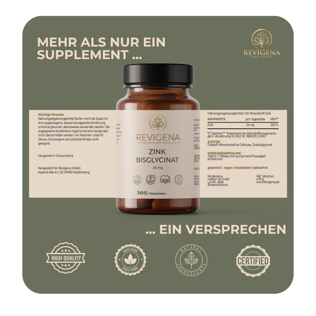 Unser Produkt enthält 25 mg elementares Zink in Form von Bisglycinat, einer organischen Verbindung, die vom Körper besonders gut aufgenommen und vertragen wird. Diese Chelatform ist magenfreundlich und für eine langfristige Einnahme geeignet.