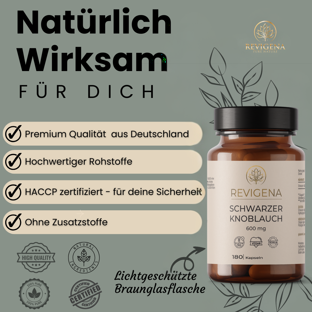 Schwarzer Knoblauch entsteht durch eine schonende Fermentation von frischem Knoblauch. Durch diesen natürlichen Reifeprozess wandeln sich scharfe Schwefelverbindungen in milde, gut verträgliche Wirkstoffe mit hoher antioxidativer Kapazität um – insbesondere in S-Allylcystein (SAC), das für viele der gesundheitsfördernden Effekte verantwortlich gemacht wird.