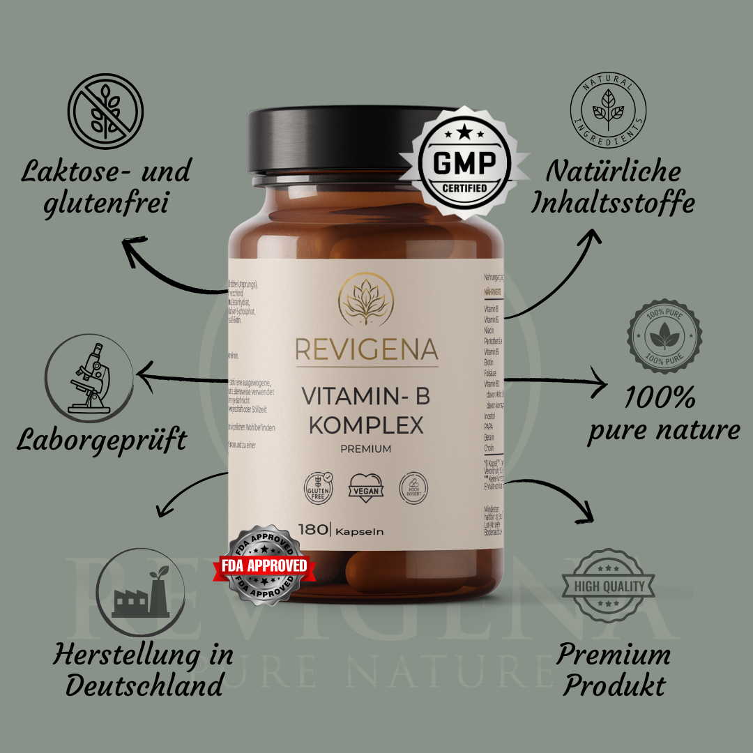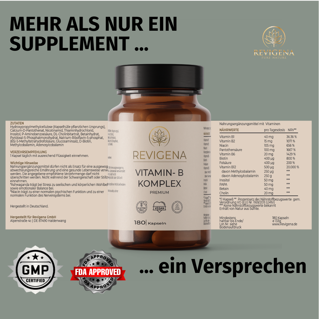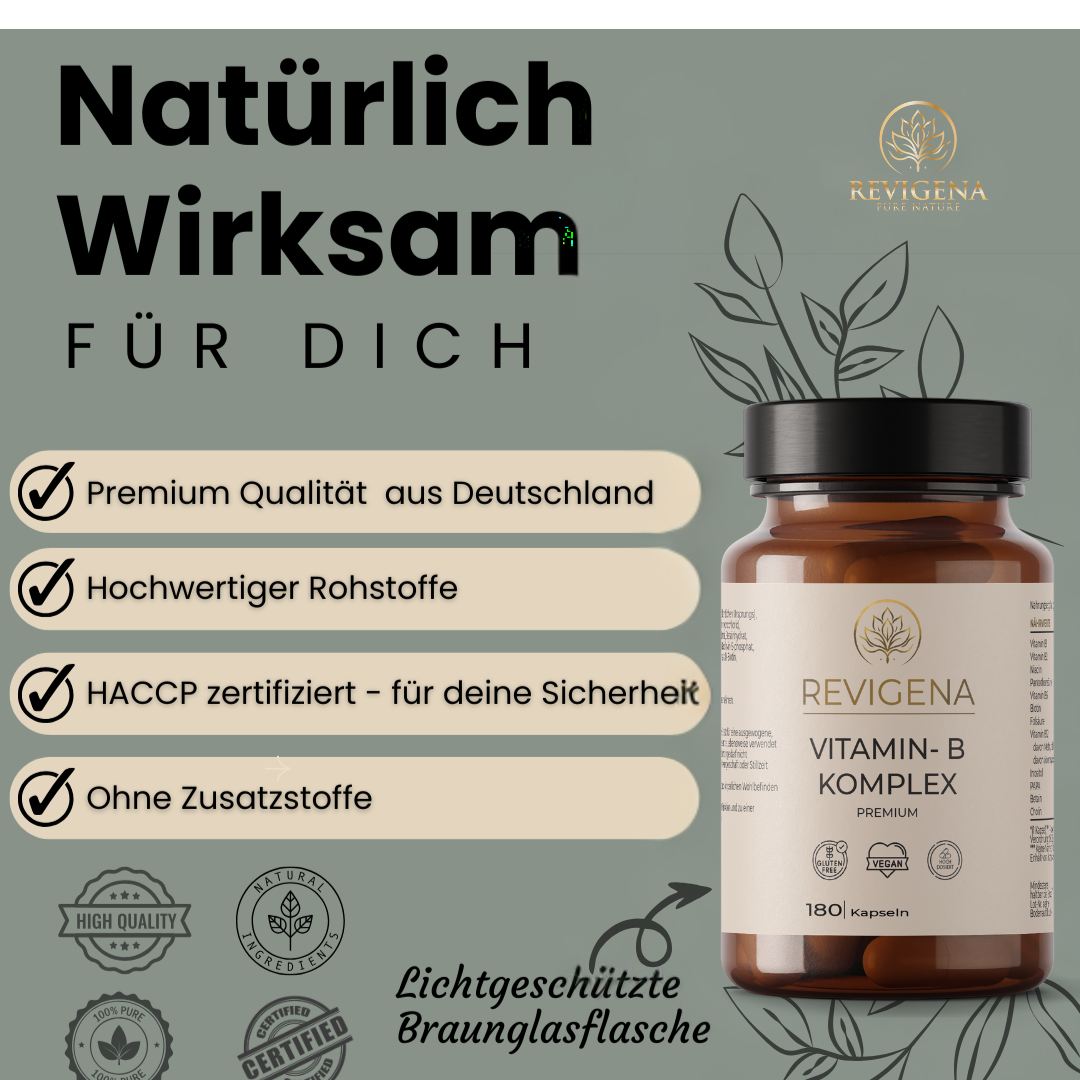 B-Vitamine sind wasserlöslich und können vom Körper nicht gespeichert werden – darum ist eine tägliche Zufuhr wichtig. Der Vitamin-B-Komplex enthält alle acht B-Vitamine: B1, B2, B3, B5, B6, B7 (Biotin), B9 (Folsäure) und B12 – in biologisch aktiven und hoch bioverfügbaren Formen.
