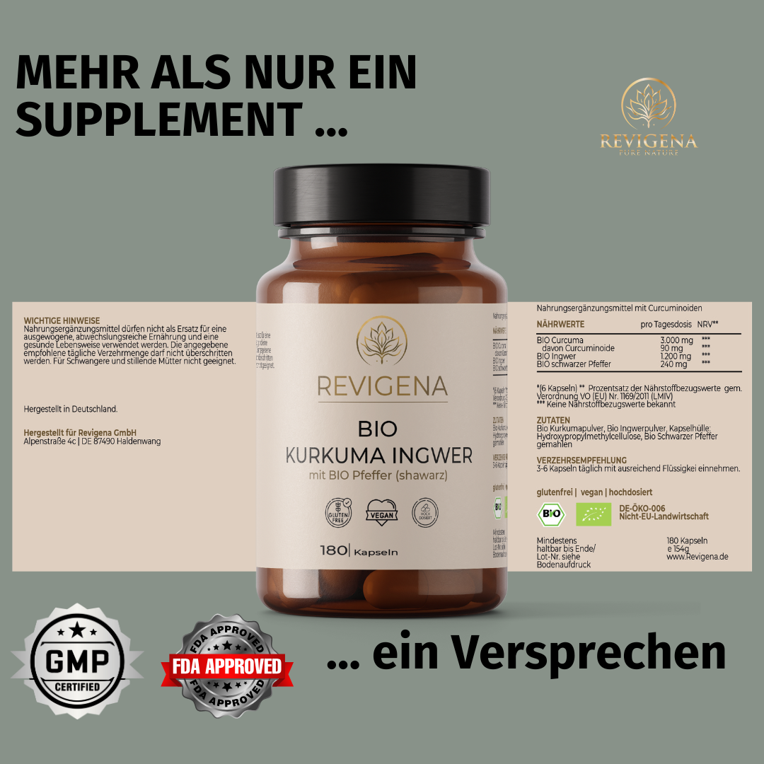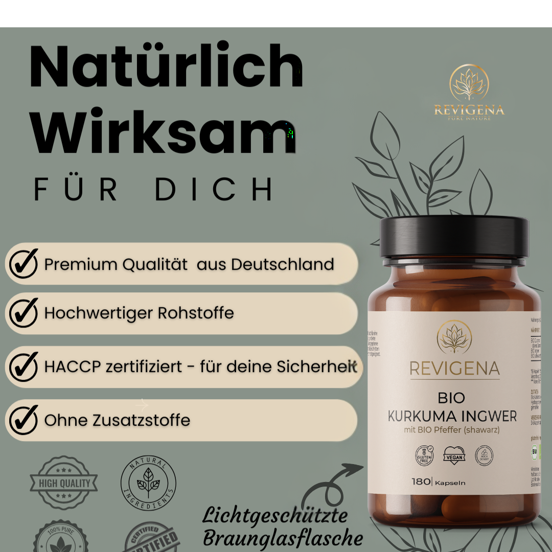 The product contains high-quality curcumin (e.g., as an extract with a defined curcuminoid content), natural ginger extract, and is vegan and free of additives.